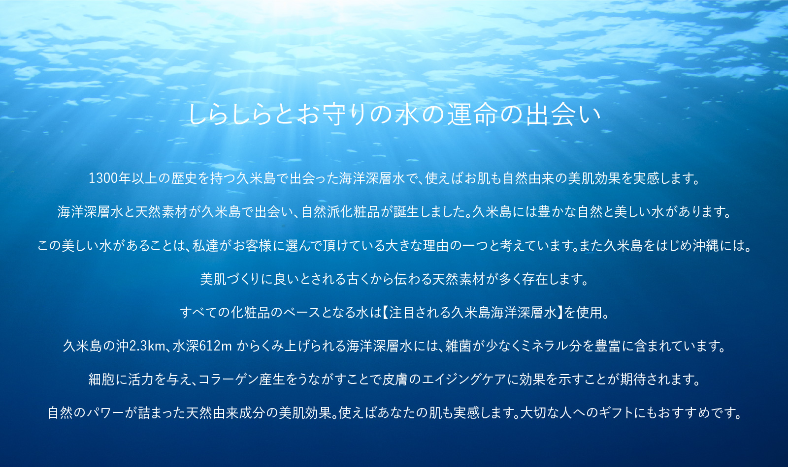 BRAND MESSAGE DESIGN CONCEPT BRAND MESSAGE DESIGN CONCEPT BRAND MESSAGE | ブランドメッセージ お守りの水を唯一無二のあなたに お守りの水とは? 久米島海洋深層水について 久米島海洋深層水を利用するメリット 久米島海洋深層水ブランドマーク